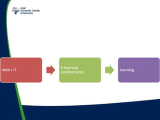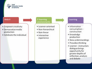 The document discusses the evolution of e-learning from Web 1.0 to Web 3.0, highlighting the shortcomings of early digital learning solutions that failed to consider diverse learning needs. It emphasizes the potential of the next generation of e-learning, driven by Web 3.0 technologies, to create more engaging and personalized educational experiences. Key elements include learning objects, digital repositories, and the importance of sharing as a fundamental aspect of meaningful learning.
