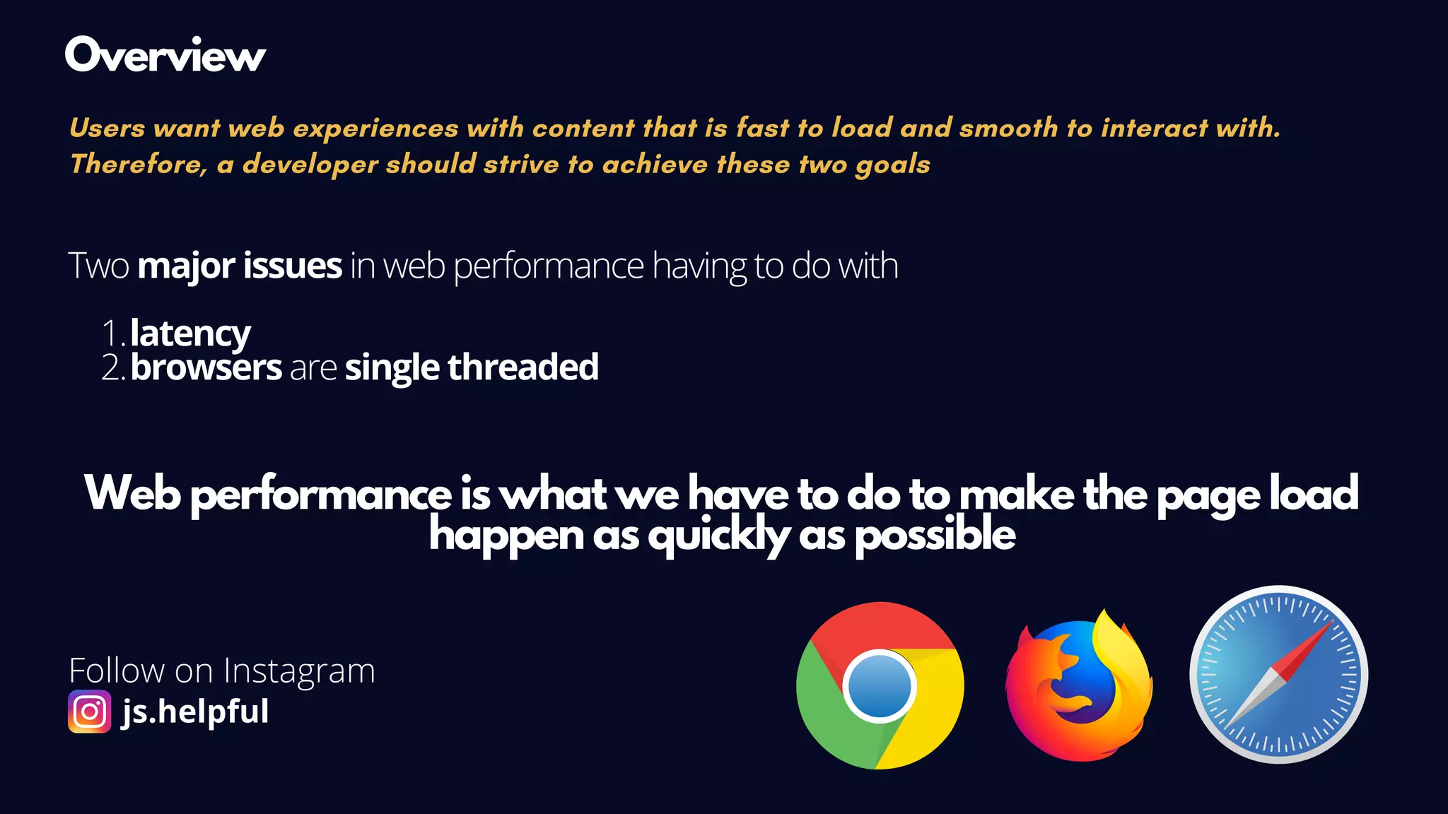 The document outlines key factors affecting web performance, emphasizing the importance of latency and fast load times for optimal user experience. It details the processes involved in page loading, including DNS lookup, TCP handshake, and how the browser parses and renders HTML, CSS, and JavaScript. Additionally, it discusses performance concerns related to rendering and reflows, suggesting best practices for optimizing web applications.