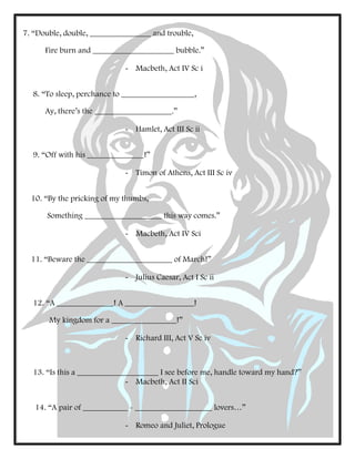 The document is a fill-in-the-blank quiz featuring famous phrases from Shakespeare's plays. It encourages participants to recall and complete lines from various works, such as 'Hamlet,' 'Romeo and Juliet,' and 'Macbeth.' The exercise aims to highlight how much one may already know about Shakespeare's language.