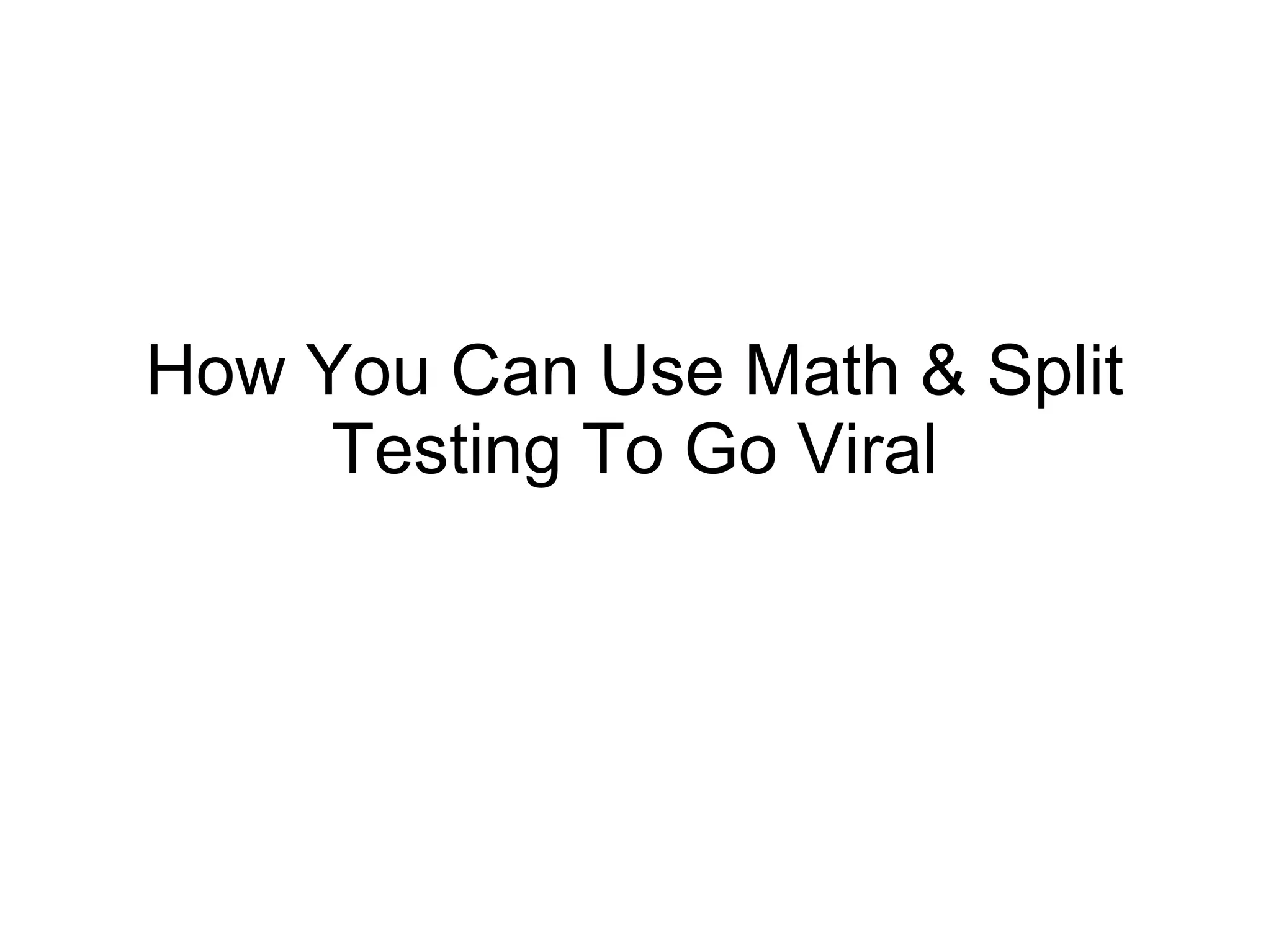 The document discusses how to make content go viral through math and split testing. It defines going viral as rapid sharing online and measures virality through a content's K-factor, which is the product of invitations sent and conversion rate - a K-factor over 1 indicates growth. It recommends engineering content to boost user engagement by increasing social login, automatic login, notifications, and shareable events. Finally, it outlines six factors (STEPPS) and strategies to encourage sharing, including incentives, easy sharing tools, emotional triggers, and ego appeals.