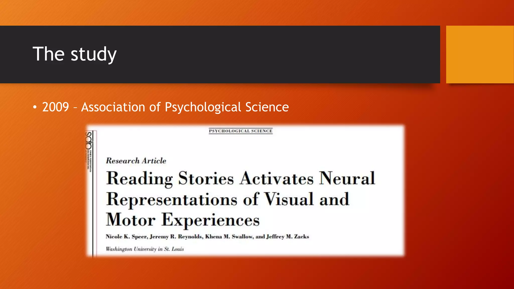 The document summarizes a 2009 study that found readers experience stories neurologically in a similar way to how the characters experience events in the narrative. When components of a story like time, cause, subject, space, and objects change, they initiate neural reactions as if experiencing the events firsthand. Hearing stories leaves a neurological impact on listeners and using testimonials and stories of transformation in presentations can help audiences experience the key components the storyteller wants them to feel.
