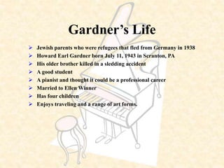 Howard Gardner is an American psychologist who developed the theory of multiple intelligences. The theory posits that intelligence is not a single general ability but rather consists of at least eight relatively independent faculties or intelligences. Gardner identified eight intelligences: linguistic, logical-mathematical, spatial, bodily-kinesthetic, musical, interpersonal, intrapersonal, and naturalist. Gardner's theory challenged the traditional view that intelligence is a single general ability and that it can be adequately assessed by paper-and-pencil tests. His work has had significant influence on educational practices and theories of learning.