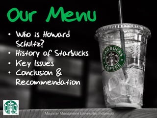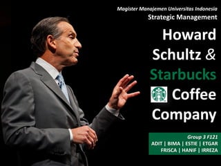 Howard Schultz founded Starbucks in 1987 after purchasing the small Seattle-based coffee chain. Under his leadership, Starbucks grew rapidly by establishing specialty coffee shops across North America and beyond. Key factors in Starbucks' success included Schultz's entrepreneurial vision, a focus on high-quality coffee and customer experience, and strategic expansion. While rapid growth brought management challenges, Starbucks differentiated itself through its coffee expertise and ability to create a welcoming third place environment for customers. To remain competitive, Starbucks must continue innovating its offerings while retaining the qualities that have made its brand successful globally.