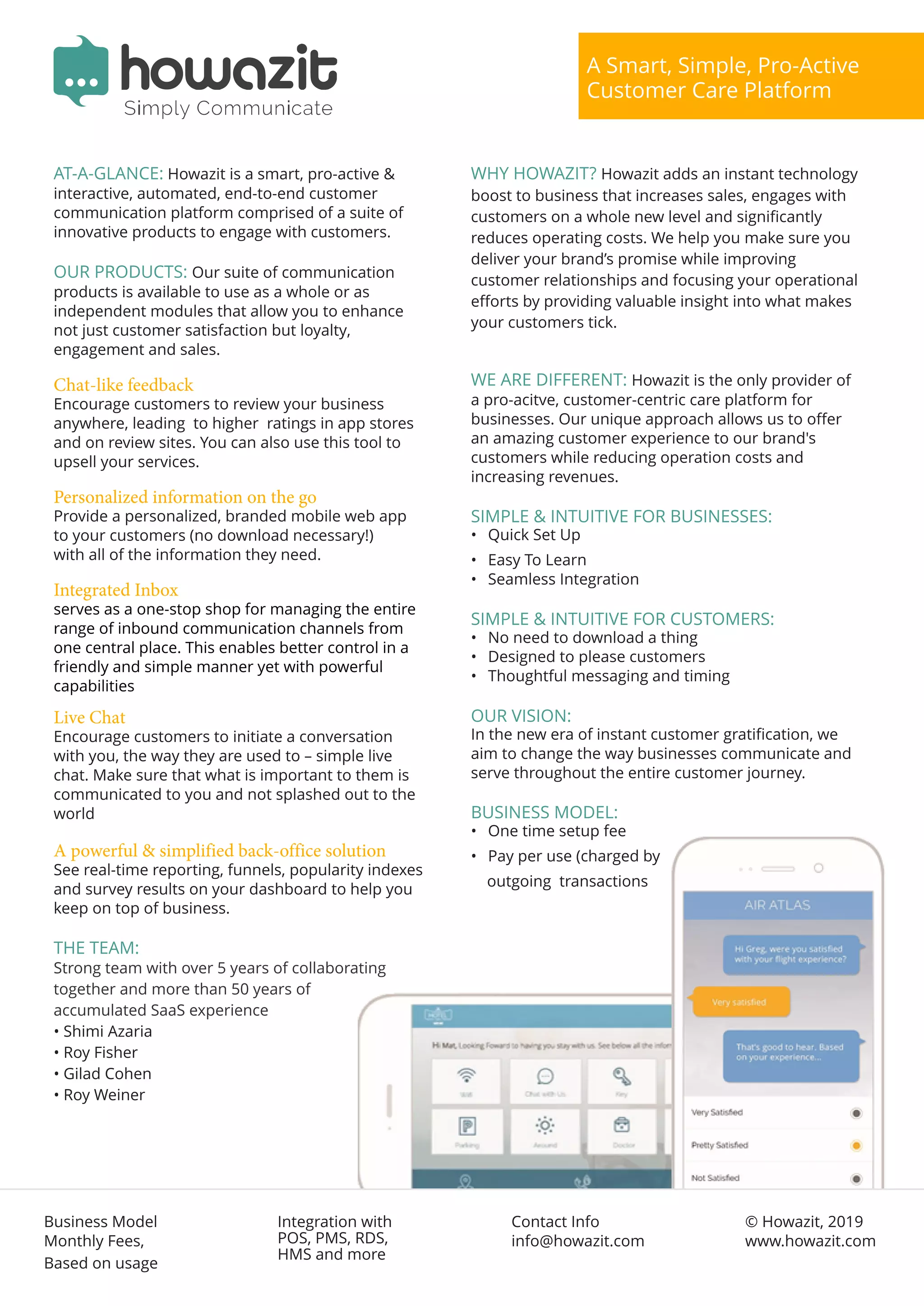 Howazit is a proactive customer care platform that uses technology to boost businesses. It engages customers through personalized communication across multiple channels to improve relationships and provide insights. This increases sales and reduces costs compared to traditional customer support. Howazit offers chat, feedback, mobile apps and a back office dashboard to give businesses control over the entire customer journey through a simple and intuitive interface. The company aims to change how businesses serve customers with an end-to-end communication solution.