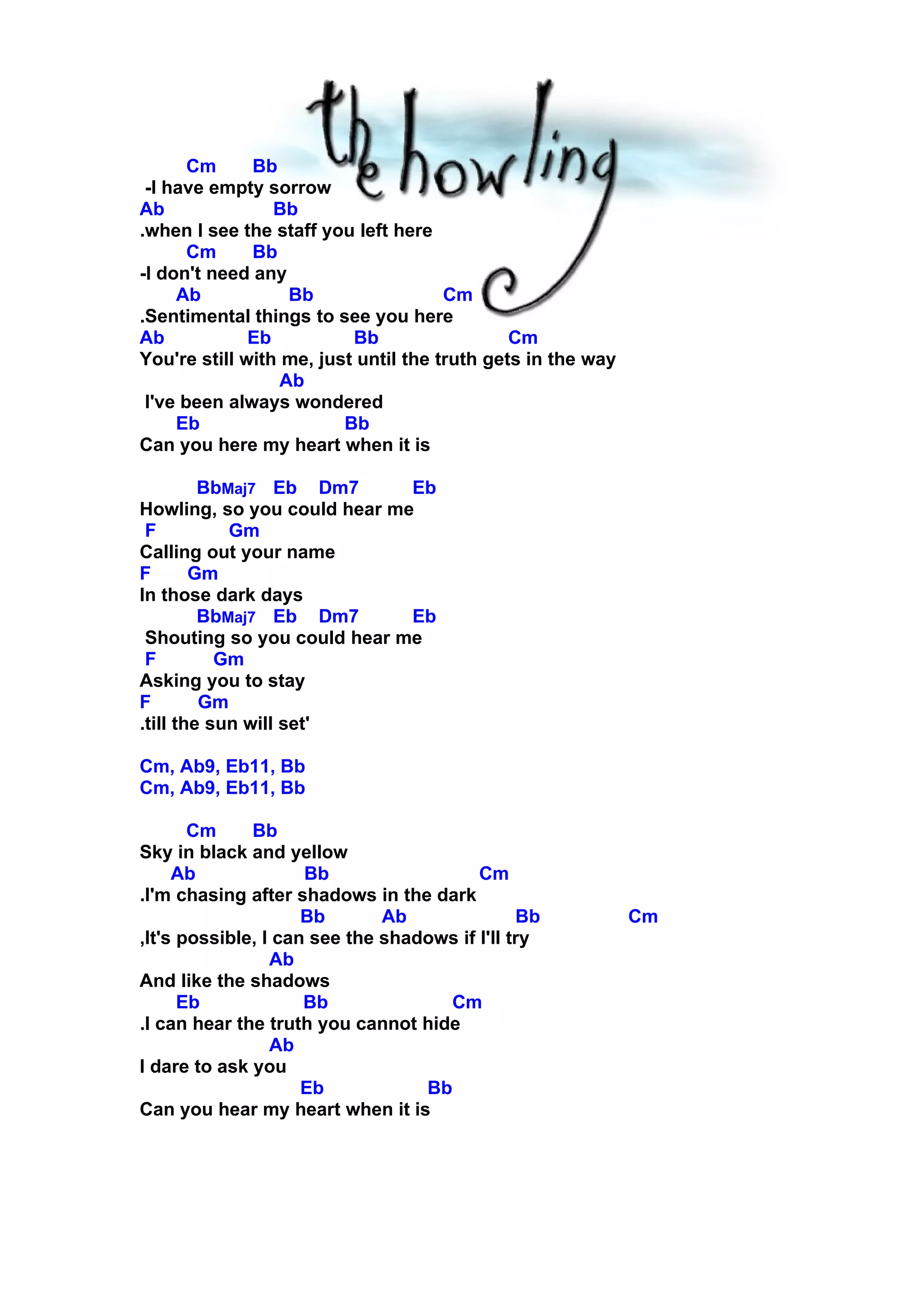 The singer feels empty sorrow when seeing something that reminds them of their lost love. They still feel the love's presence with them until reality intervenes. The singer has always wondered if their love could hear their heart howling and calling out to them in dark times, shouting to be heard and asking their love to stay until sunset. The sky is black and yellow as the singer chases shadows, believing they can see and hear the truths their love cannot hide. The singer dares to ask if their love can hear their heart howling, calling their name in dark days, shouting and saying goodbye again as it's their last farewell.