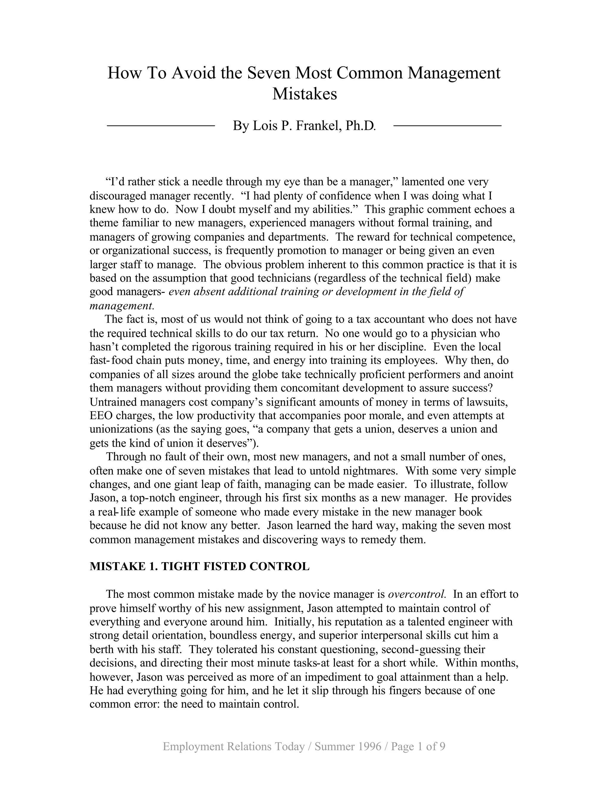 The document discusses common mistakes made by new managers. It details the experiences of Jason, a new manager who made all seven common mistakes. Mistake 1 was tight-fisted control, where Jason tried to maintain control over everything instead of empowering his team. Mistake 2 was "expertizing" where Jason developed a restructuring plan independently instead of involving his team's expertise. Mistake 3 was failing to build a team, as Jason did not hold team meetings to foster collaboration. The remedies discussed are to share power and control with the team, trust the team's expertise, and schedule regular team meetings to encourage participation and team spirit. New managers are cautioned against trying to be experts in everything