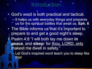 The document provides guidance from the Bible on how to get a good night's sleep. It discusses that sleep is a gift from God and explains potential causes for insomnia like having one's life out of tune with God. It then offers several suggestions based on Bible verses for preparing for sleep, including meditating on God's character, reviewing his promises, praying, trusting in his protection, and using common sense. It closes by urging those who are not Christians to become one by coming to Jesus, believing his gospel, repenting of sin, confessing him, and being baptized.