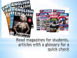 This document provides tips for learning English outside the classroom, including using grammar and vocabulary books at home, reading books and materials in English, listening to English radio and music, watching English films and television with subtitles, studying English online, watching the news in English, and discussing learning techniques with a partner. It emphasizes that the individual learner decides how and what they study on their own. Additional suggestions are given for remembering new vocabulary words through repetition, translation, drawing pictures, using opposites and synonyms, creating sentences, recording words, and categorizing words.