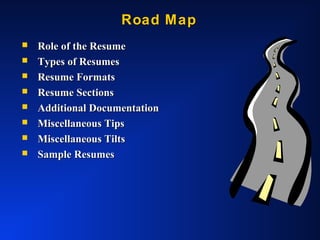 The document provides tips for writing an effective resume. It discusses the role and purpose of a resume, different resume formats and sections, and tips for delivery. The key points are that a resume should be a one-page marketing document highlighting relevant skills and achievements to convince employers the applicant is qualified for the position. Sections generally include contact information, objective, education, experience, and courses or projects. The resume should have a consistent professional format and focus on outcomes rather than just duties.