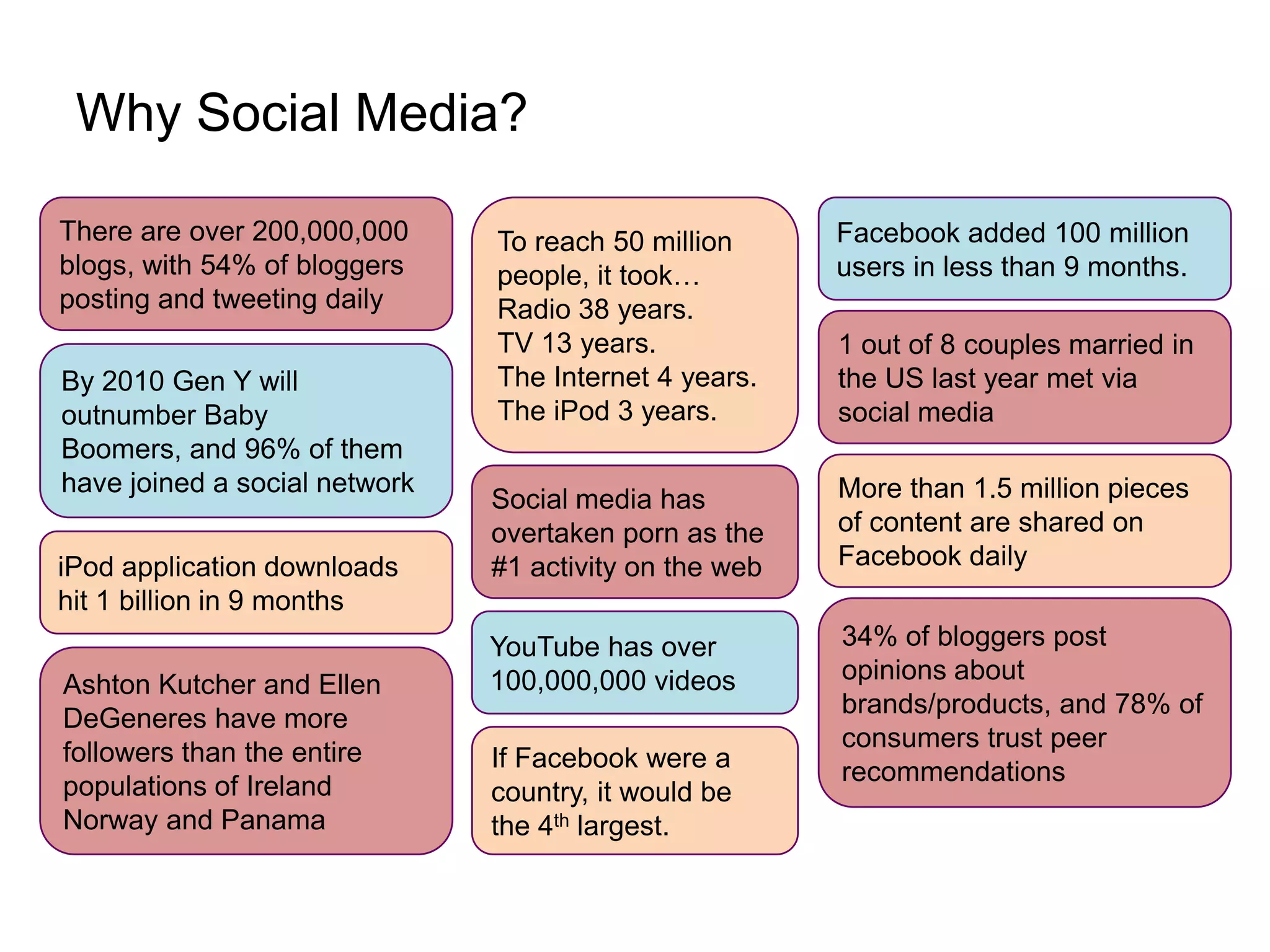 The document provides an overview of using social media for business purposes. It notes that social media has overtaken other forms of media in reaching large audiences quickly. It recommends businesses first understand their target audience by listening to what interests them and where they engage online. It then outlines five basic steps: 1) listen and learn, 2) define your strategy and guidelines, 3) engage your audience, 4) meet offline to build relationships, and 5) measure your results and impact. The document emphasizes being authentic and adding value through social media interactions.