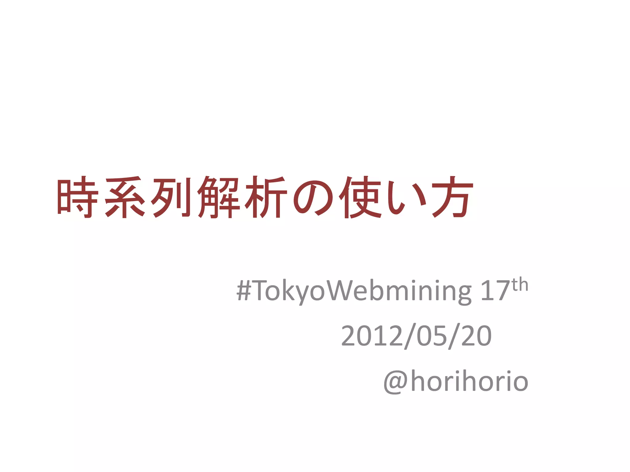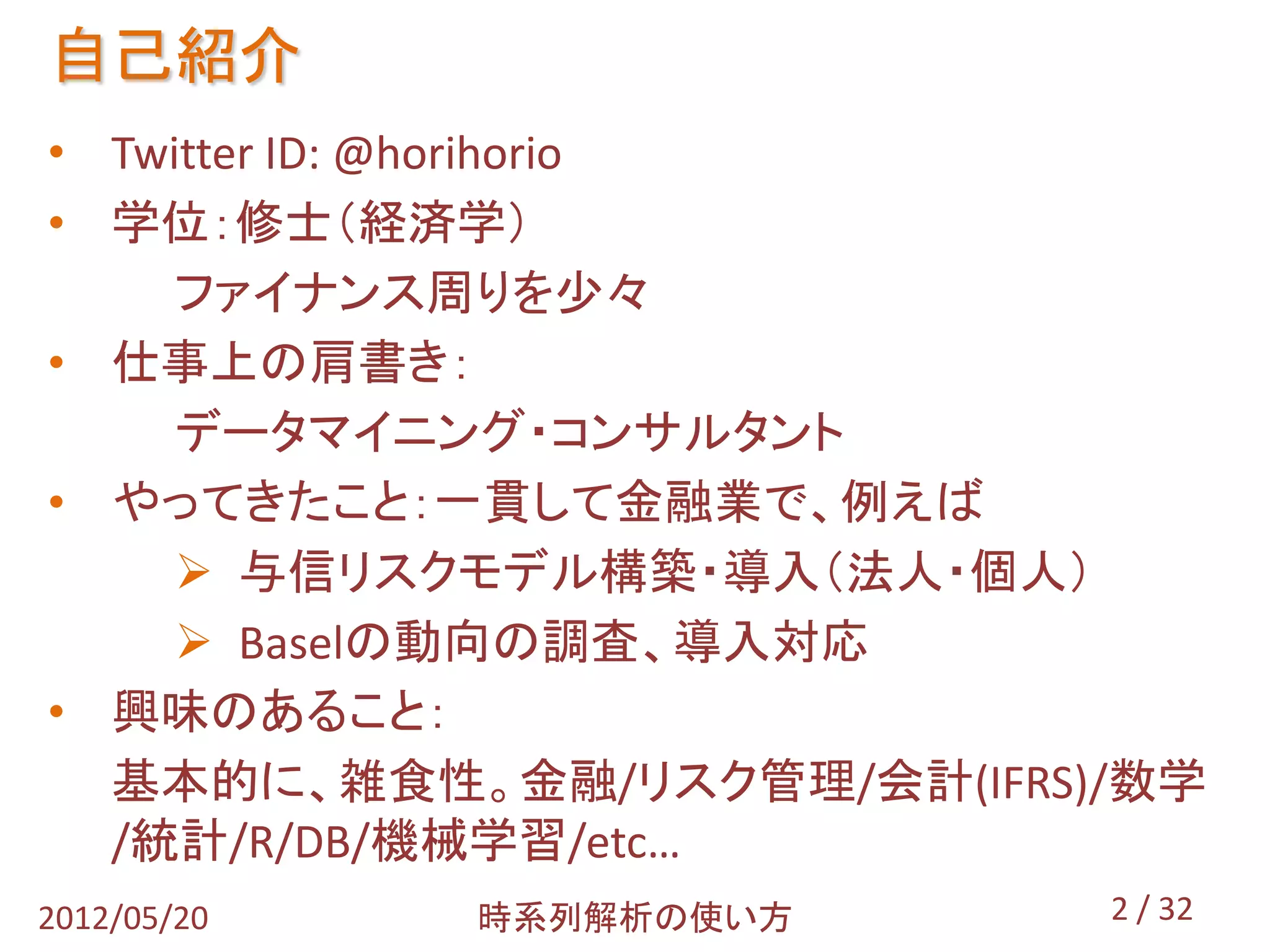 @horihorio • 学位:修士(経済学) ファイナンス周りを少々 • 仕事上の肩書き: データマイニング・コンサルタント • やってきたこと:一貫して金融業で、例えば 与信リスクモデル構築・導入(法人・個人) Baselの動向の調査、導入対応 • 興味のあること: 基本的に、雑食性。金融/リスク管理/会計(IFRS)/数学 /統計/R/DB/機械学習/etc… 2012/05/20 時系列解析の使い方 2 / 32