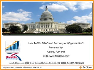 The document discusses how small businesses can leverage opportunities from the BRAC and Recovery Act, emphasizing the importance of understanding government purchasing processes and strategic marketing. It highlights key funding projects and tactical approaches for identifying and securing government contracts. The presenter, Gaurav 'GP' Pal, offers insights and solutions through his company, FedXCCEL, aimed at helping businesses navigate the federal market more effectively.