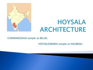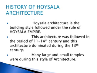 The document discusses Hoysala architecture and two prominent temples constructed in this style - the Chennakesava Temple at Belur and the Hoysaleswara Temple at Halebidu. It notes that Hoysala architecture flourished between the 11th and 14th centuries, producing many ornate temples. It provides background on the Hoysala Empire and highlights key features of the two temples such as their construction details, sculptures, and religious significance.