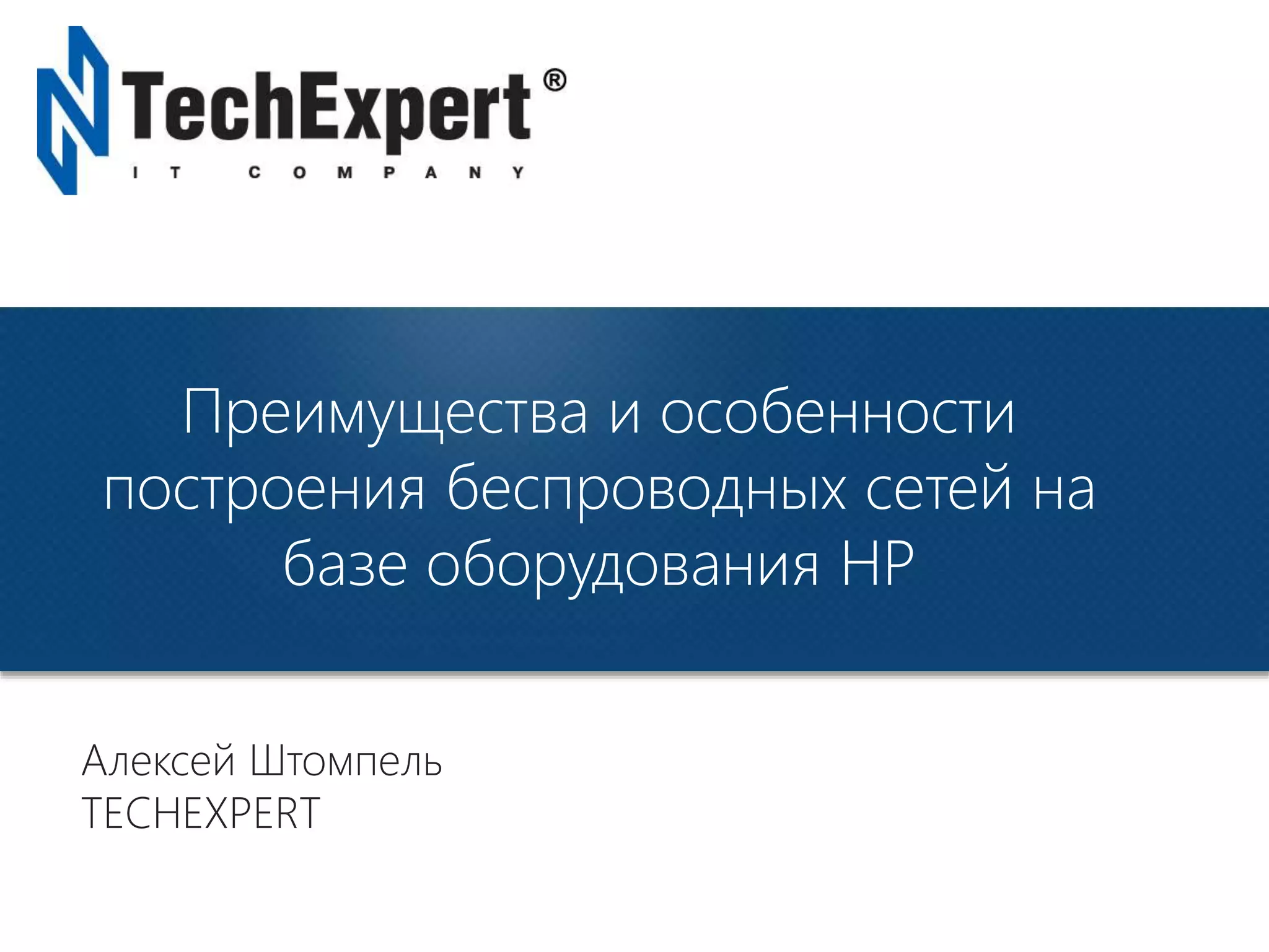 Документ описывает преимущества и особенности построения беспроводных сетей с использованием оборудования HP от компании Techexpert, включая различные модели контроллеров и точки доступа. Также рассматриваются характеристики управления сетью, оптимизации производительности и обеспечения безопасности. В документе упоминаются успешные проекты и решения, реализованные с учетом современных требований к беспроводной инфраструктуре.
