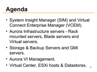 This document provides an agenda for a presentation on HP Blade technology. The agenda includes introductions to HP Blade chassis, onboard administrators, Virtual Connect Flex-10 modules, Cisco modules, system management tools, different types of Aurora servers, storage servers, and cluster configuration. It also discusses NTP server configuration, questions, and demonstrations of HP Blade hardware components and management modules.