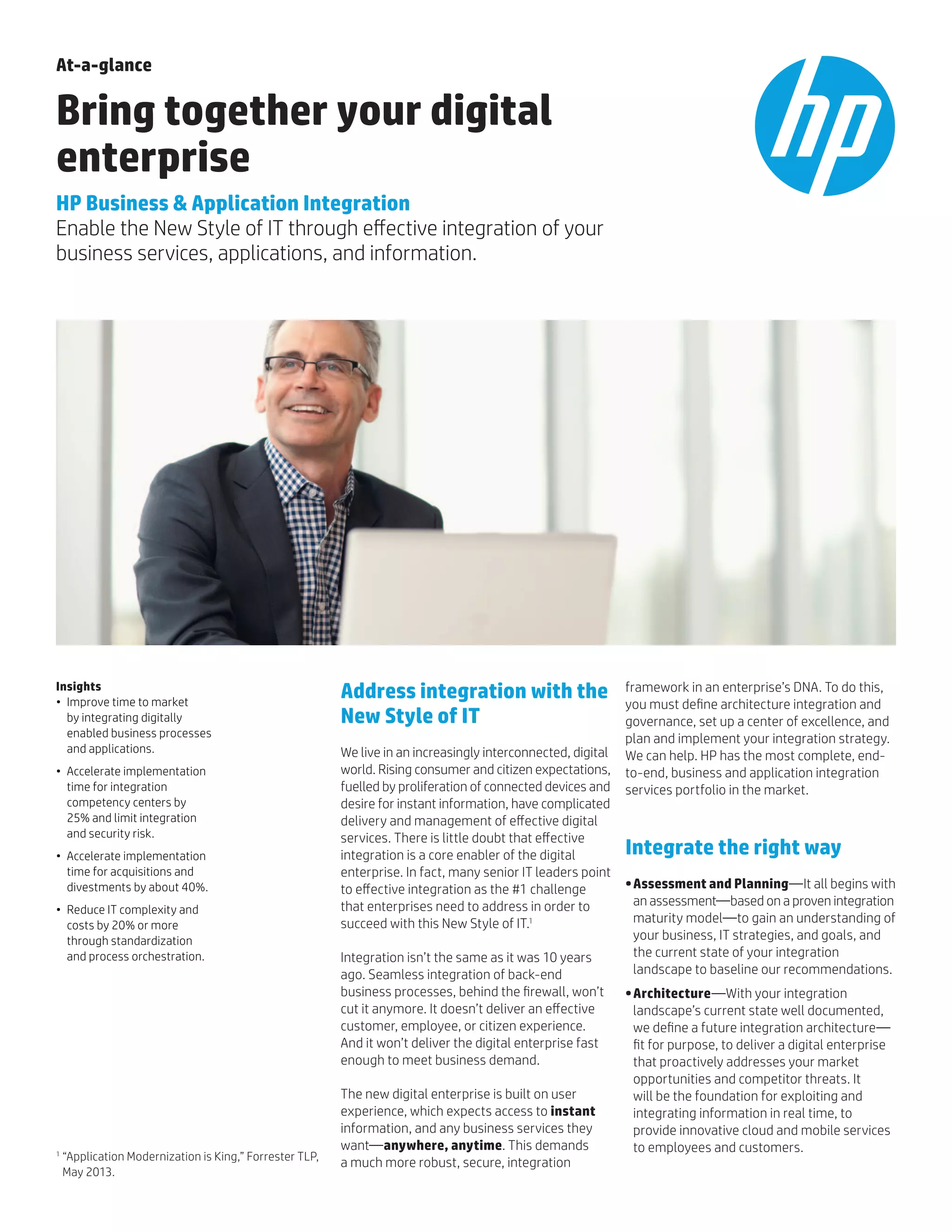 The document outlines the importance of effective business and application integration for digital enterprises, emphasizing the need for a robust integration framework to meet rising customer expectations and market demands. It details HP's comprehensive integration services and methodologies, including assessment, architecture design, management, and governance, aimed at delivering efficient, innovative, and timely digital solutions. Success stories highlight HP's role in improving time-to-market, reducing costs, and enhancing overall business effectiveness across various industries.