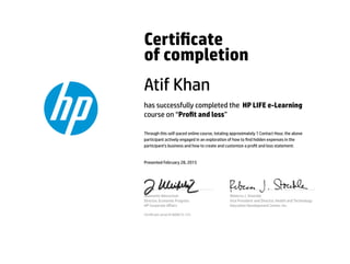 This certificate of completion recognizes that Atif Khan successfully completed a 1 hour online course through HP LIFE on "Profit and Loss" on February 28, 2015. The course explored how to find hidden expenses in a business and how to create and customize a profit and loss statement. The certificate was signed by the Director of Economic Progress at HP and the Vice President and Director of Health and Technology at the Education Development Center.