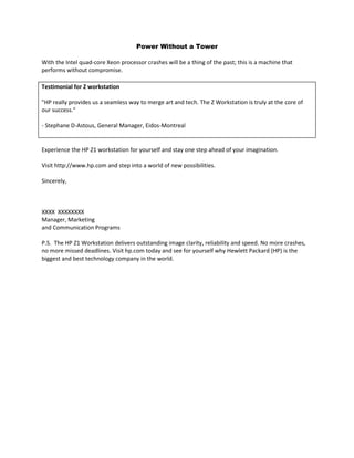 The document is a letter promoting the new HP Z1 Workstation. It summarizes the key features of the Z1 Workstation including its large 27" display with high color support and wide viewing angle, easy snap open design for upgrading parts with no tools, up to 3TB of hard drive space and fast NVIDIA graphics. It also highlights the Intel quad-core processor to prevent crashes and provides a testimonial from a customer praising the workstation for merging art and technology. The letter encourages visiting the HP website to learn more about the new possibilities of the cutting-edge Z1 Workstation.