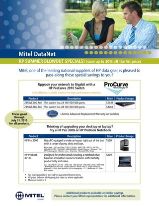 Mitel is offering special savings of up to 30% off list prices on HP networking and computing products through July 31, 2010. This includes HP ProCurve 2910 switches with either 24 or 48 Gigabit ports for $2,449 and $4,469 respectively. Also discounted are the HP Pro 3000 desktop starting at $599 and HP ProBook 4710s notebook for $809. A variety of other HP products have comparable savings.