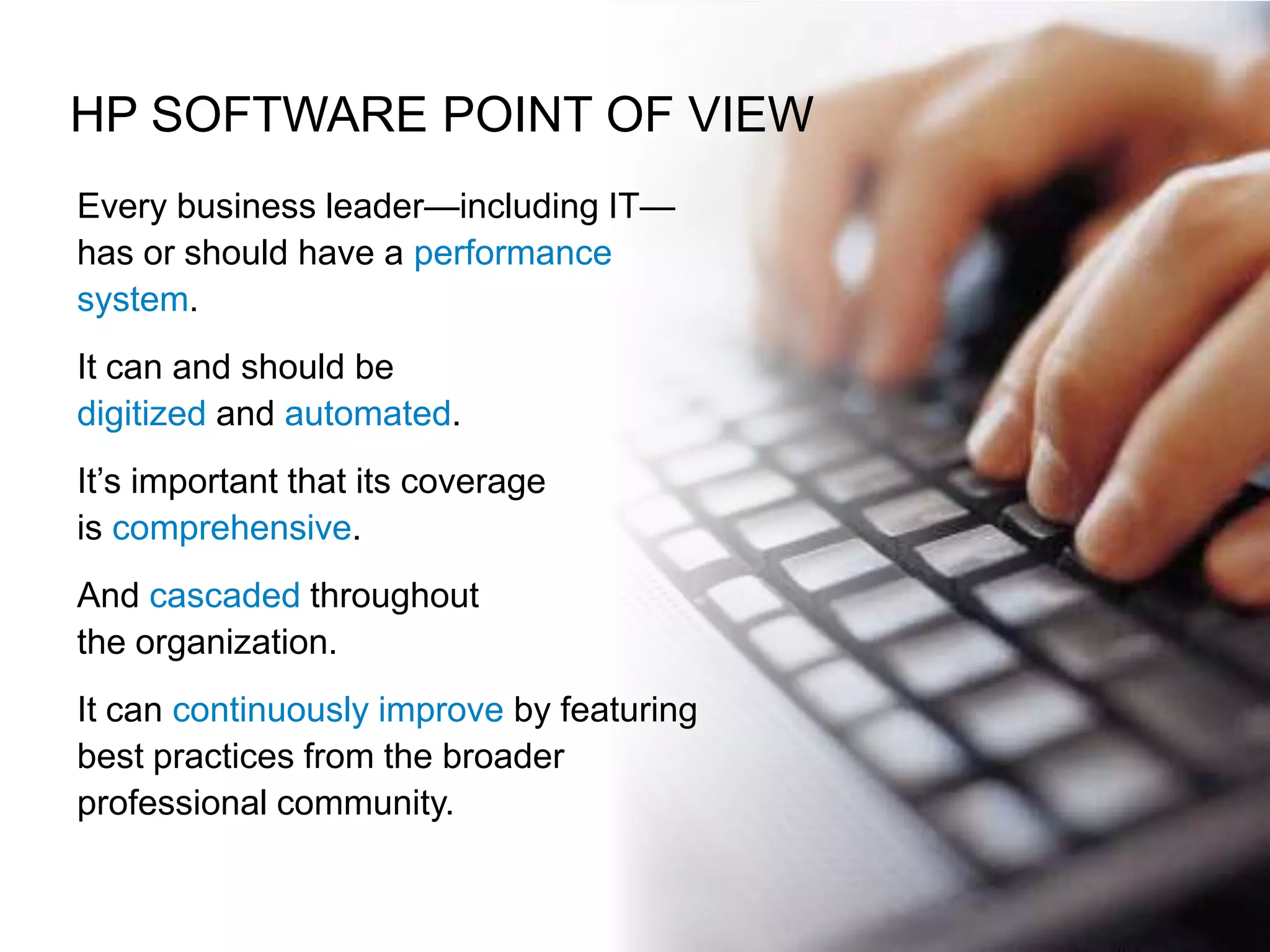 This document discusses the HP IT Performance Suite, which provides tools to help organizations optimize IT performance. It includes an Executive Scorecard that gives business leaders visibility into key IT performance metrics. The suite also features modules for strategy, planning, application development, operations management, and security. HP professional services help customers implement the suite through workshops, consulting, training, and support services. The goal is to help IT organizations and CIOs "perform better" by improving areas like operations, innovation, cost management, and agility.