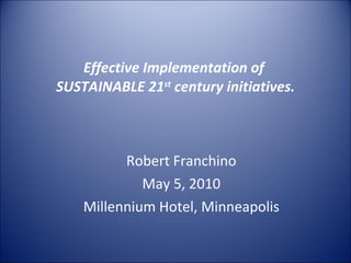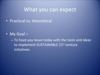 The document discusses implementing sustainable 21st century initiatives in schools. It outlines 6 topics to be covered: 1) creating a foundation and culture for technology, 2) distinguishing needs from initiatives, 3) sustainable student and teacher laptop programs, 4) staff development and accountability, 5) embracing 21st century initiatives, and 6) a question and answer session. The goal is to provide tools and ideas to help schools successfully adopt technology initiatives through establishing clear expectations, leadership teams, differentiated staff training, and embracing technological change.