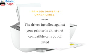 The document provides troubleshooting steps for the 'printer driver is unavailable' error on HP printers, indicating that the installed driver may be incompatible or outdated. Recommended actions include unplugging the USB cable, uninstalling HP printer entries from the control panel, removing printer devices, checking for Windows updates, and restarting the PC. For further details, the document directs users to the website printeralign.com.