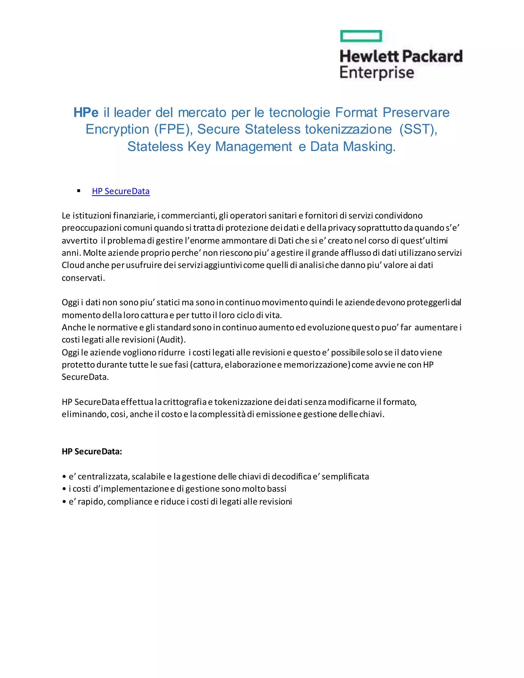HPE è leader nelle tecnologie per la protezione dei dati, offrendo soluzioni come la crittografia a formato preservato e la tokenizzazione sicura, che aiutano le aziende a gestire l'enorme quantità di dati mantenendo la privacy. Con HP SecureData, è possibile proteggere i dati in tutte le fasi del loro ciclo di vita, ottimizzando costi e complessità legate alla gestione delle chiavi. La piattaforma è compatibile con diverse normative di sicurezza e privacy, garantendo una protezione end-to-end senza compromettere la funzionalità dei sistemi.