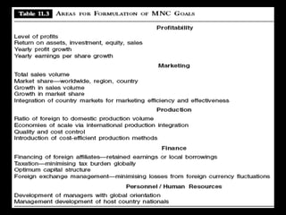 International strategic management involves determining a firm's mission, objectives, and strategic plan. It requires evaluating internal resources and external opportunities/threats. Key elements include environmental scanning, internal analysis, goal setting, and implementation. Strategies must balance global integration with national responsiveness. Options include global, multi-domestic, international, and transnational strategies. Specialized strategies also exist like first-mover, bottom of the pyramid, and born-global approaches. Effective strategic management is needed to coordinate diverse operations in today's complex global economy.