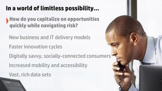 The document discusses how HP Software helps customers capitalize on opportunities while managing risks in today's digital world. It provides modular performance systems that deliver real-time, actionable intelligence from all information sources to help customers achieve confidence, insight, and agility. Case studies show how McKesson, Avis, and the U.S. Army benefited from improved application availability, informed decision making, and application security respectively.