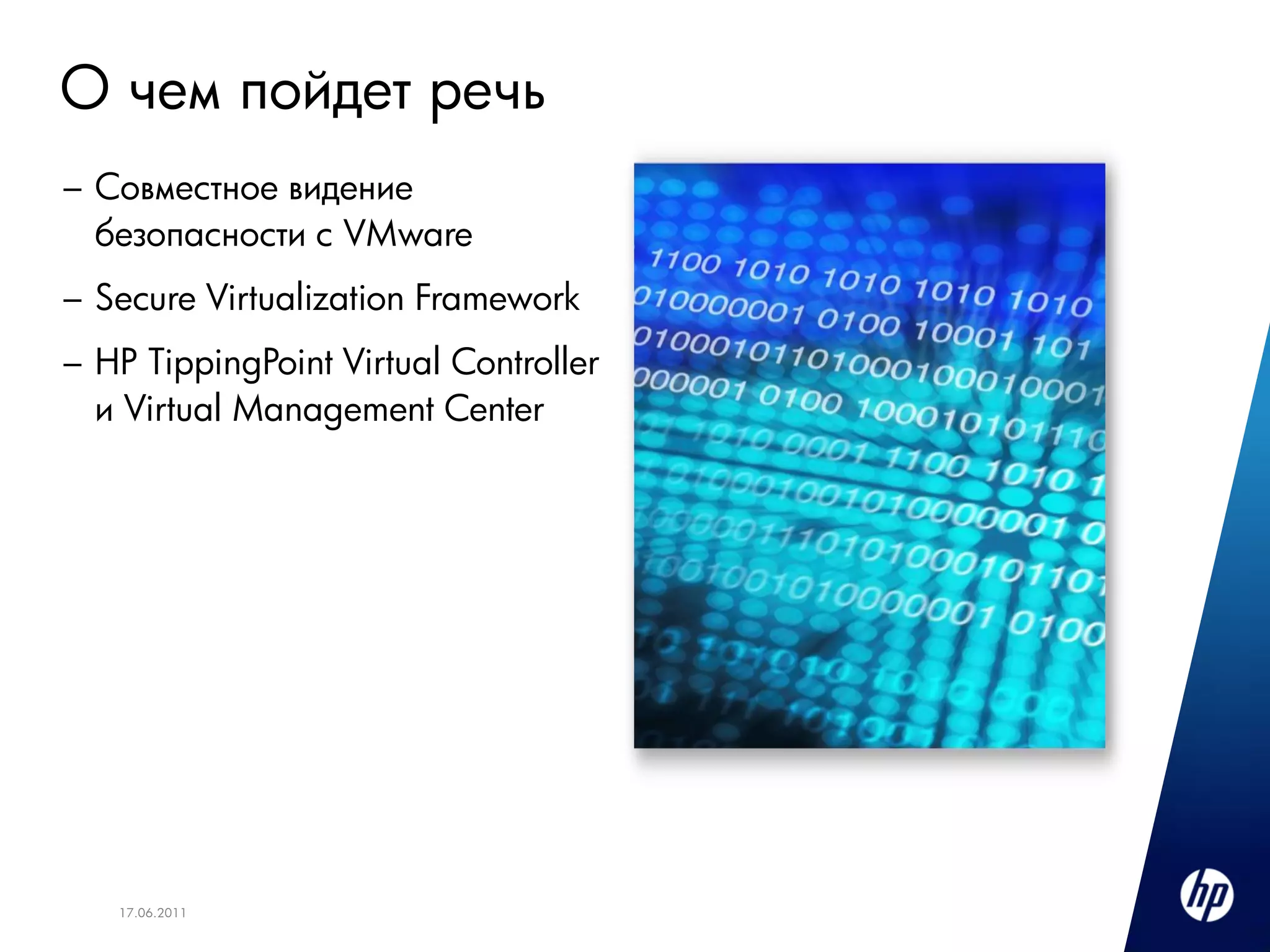 Документ описывает решения по безопасности виртуализации, предлагаемые HP в сотрудничестве с VMware, включая TippingPoint Virtual Controller и Virtual Management Center. Он акцентирует внимание на важности защиты виртуальной среды, указывая на угрозы и способы интеграции сетевой безопасности в виртуализированные инфраструктуры. Также представлены детали о внедрении, совместимости с VMware и доступных образовательных курсах для настройки этих решений.
