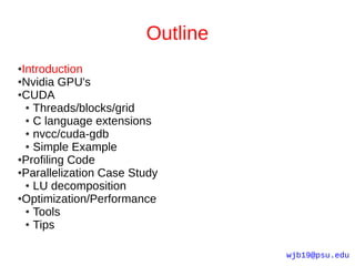 The document provides an introduction to GPU programming using CUDA. It outlines GPU and CPU architectures, the CUDA programming model involving threads, blocks and grids, and CUDA C language extensions. It also discusses compilation with NVCC, memory hierarchies, profiling code with Valgrind/Callgrind, and Amdahl's law in the context of parallelization. A simple CUDA program example is provided to demonstrate basic concepts like kernel launches and data transfers between host and device memory.