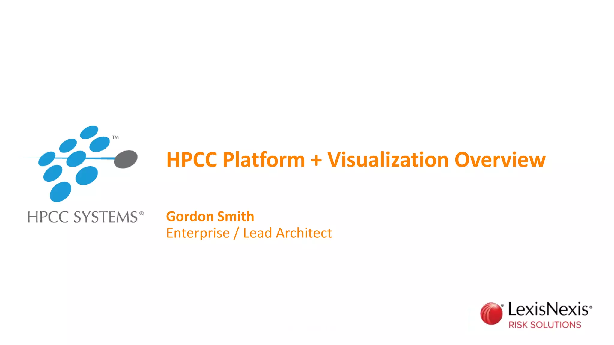 HPCC Systems is a platform for working with big data that was originally developed by various companies before being acquired by RELX Group in 2004. It uses a C++ backend with Thor for data refining, Roxie for data delivery, and ESP as an enterprise service platform. Data is processed using the ECL declarative language. The HPCC Visualization Framework provides JavaScript visualizations for embedding in web apps with a consistent data interface and published properties for serialization. It supports various chart types for visualizing workunit and Roxie data from the HPCC Platform.