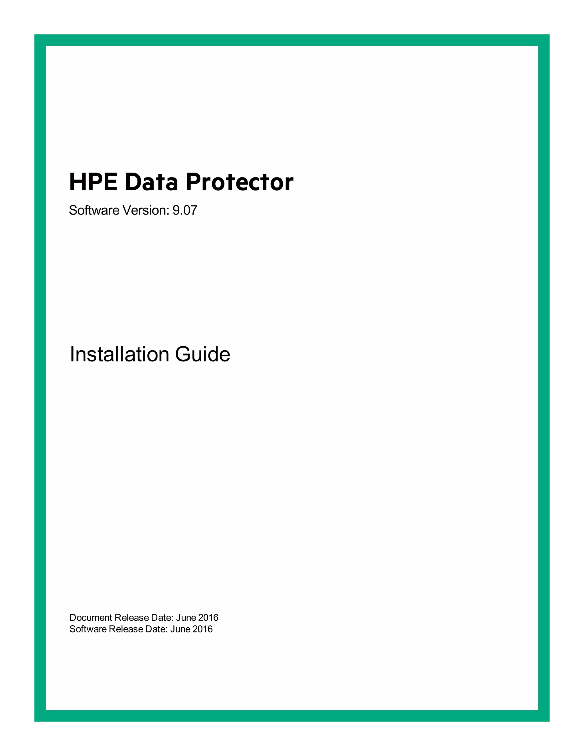 This document provides an installation guide for HPE Data Protector 9.07. It describes how to install the Data Protector Cell Manager, clients, and various integration options. The guide covers installations on Windows, UNIX, Linux and other platforms. It also provides instructions for cluster-aware installations and maintaining the Data Protector installation.