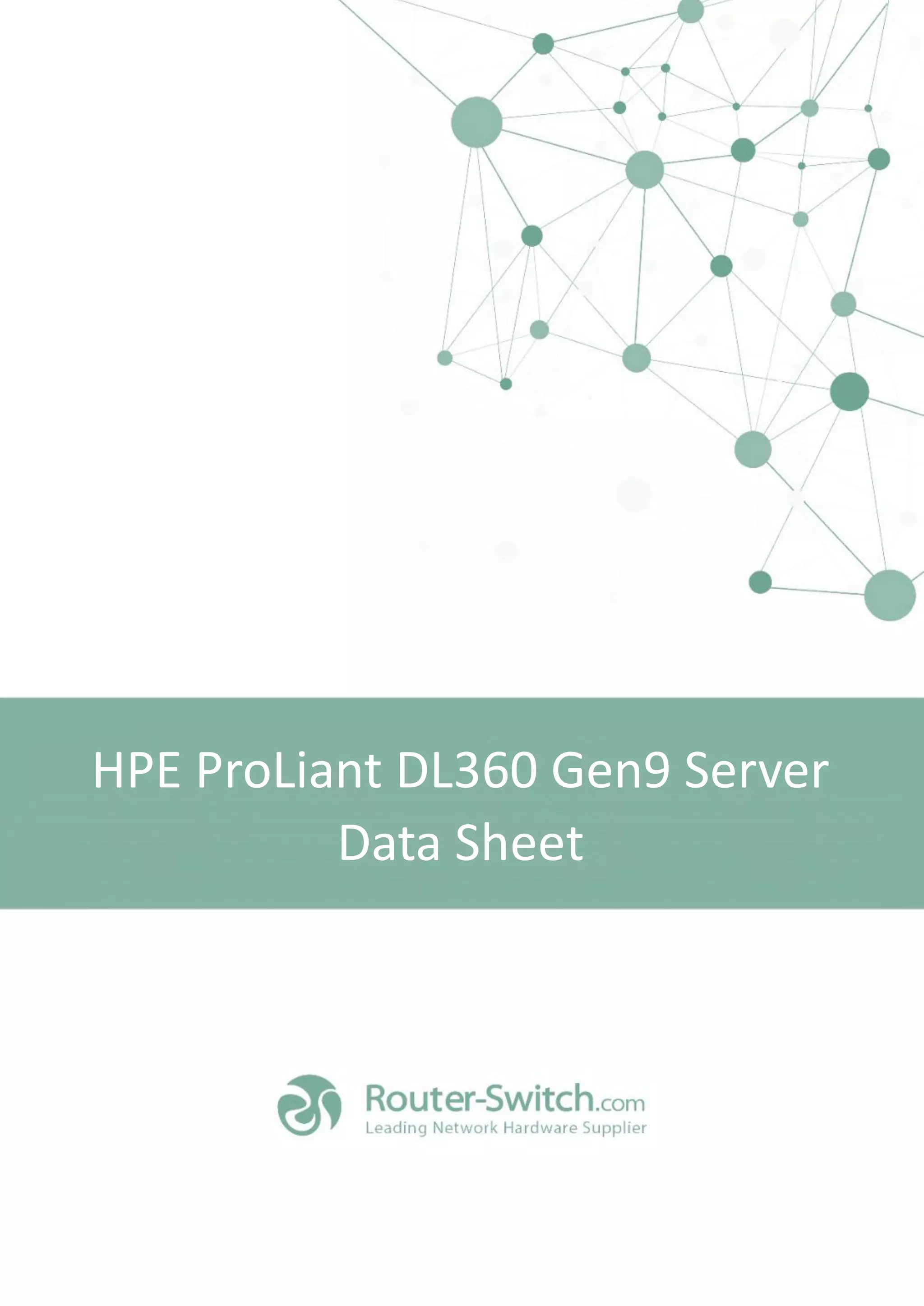 The document provides an overview of the HPE ProLiant DL360 Gen9 Server, which delivers increased performance in a 1U dense rack design. It lists the standard features including processor, memory, expansion slots, storage, power supply, cooling, and interface options. Technical specifications and purchasing information are also included.