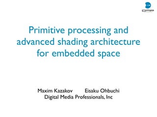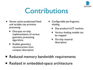 This document describes a primitive processing and advanced shading architecture for embedded systems. It features a vertex cache and programmable primitive engine that can process fixed and variable size primitives with reduced memory bandwidth requirements. The architecture includes a configurable per-fragment shader that supports various shading models using dot products and lookup tables stored on-chip. This hybrid design aims to bring appealing shading to embedded applications while meeting limitations on gate size, power consumption, and memory traffic growth.