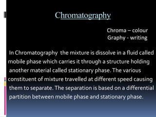 HPLC is an advanced form of liquid chromatography that uses pumps to force a pressurized liquid solvent containing a sample mixture through a column filled with adsorbent material. Each component interacts slightly differently with the adsorbent, leading to separation as components flow out the column at different rates. Key components of an HPLC system include solvent reservoirs, pumps that maintain high pressure, an injector port for samples, a column packed with porous silica or other material, and various detectors to monitor the separated components emerging from the column. HPLC is used to separate, identify, and quantify individual components in a mixture through differential partitioning between a mobile and stationary phase under high pressure.
