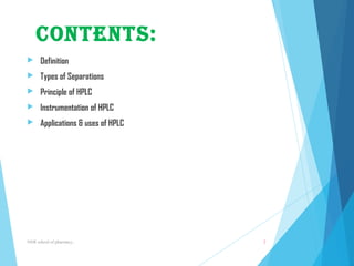 This document provides an overview of high performance liquid chromatography (HPLC). It defines HPLC as a powerful analytical technique that can separate mixtures of compounds using high pressure to accelerate the mobile phase through the column. The document then describes the basic components of an HPLC system including the solvent delivery system, pumps, injector, column, detectors, and recorder. It also discusses various modes of HPLC separation and provides examples of HPLC applications in fields like pharmaceuticals, chemicals, biosciences, and environmental analysis.