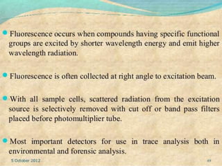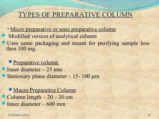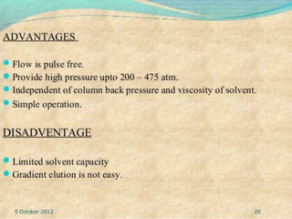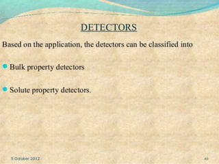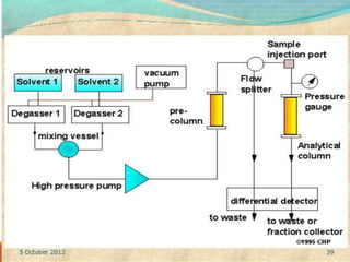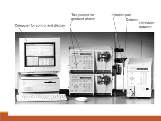 This document provides an overview of high performance liquid chromatography (HPLC). It discusses how HPLC refined traditional liquid chromatography by using smaller particle sizes, smaller column diameters, and high fluid pressures to provide enhanced separations over shorter periods of time. Key aspects of HPLC systems and processes are summarized, including the use of pumps to deliver mobile phases at high pressure through columns containing small stationary phase particles. Separation is achieved based on how sample components partition between the mobile and stationary phases. Various detectors are also outlined.