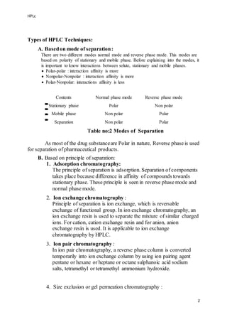 2) There are two main modes of HPLC separation - normal phase which uses a polar stationary phase and non-polar mobile phase, and reverse phase which uses a non-polar stationary phase and polar mobile phase.
