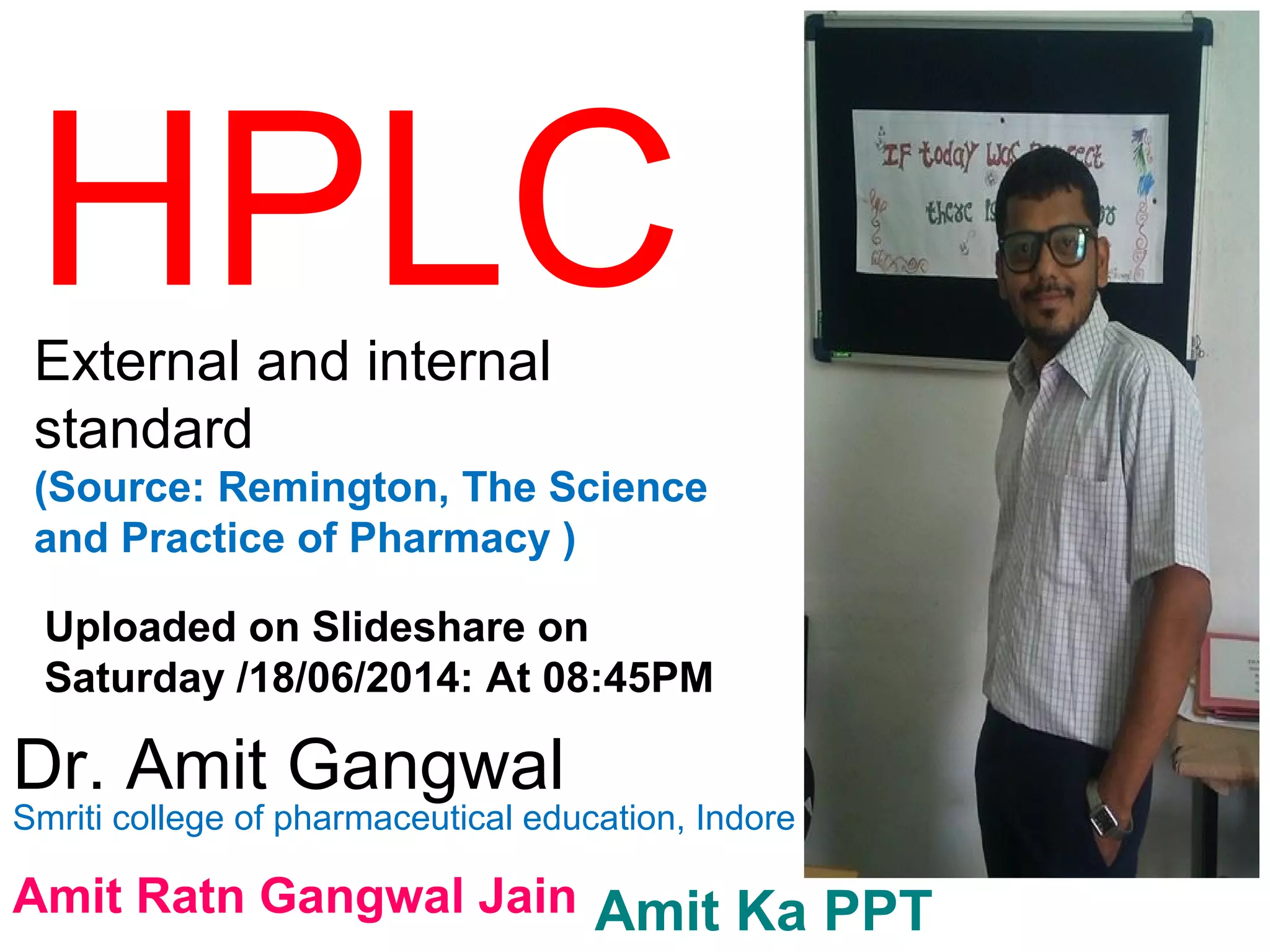 This document discusses external and internal standardization techniques for quantitative analysis using high performance liquid chromatography (HPLC). External standardization involves preparing solutions of a reference standard at known concentrations, measuring peak areas, and generating a calibration curve to determine unknown concentrations. Internal standardization adds a known amount of internal standard compound to samples and standards, and quantifies unknowns based on peak area ratios and a calibration curve plotting ratios of analytical standard to internal standard areas versus concentration ratios. The internal standardization method is commonly used for gas chromatography as it avoids needing to know exact injection amounts.