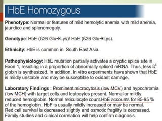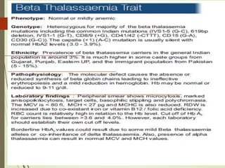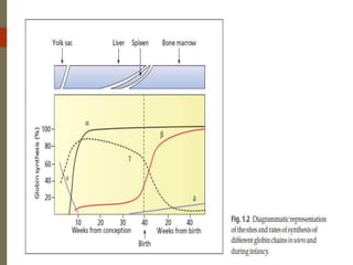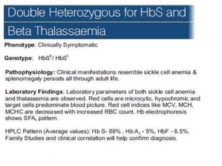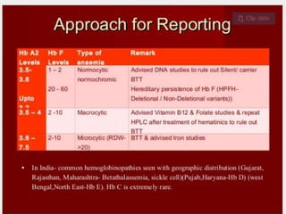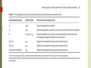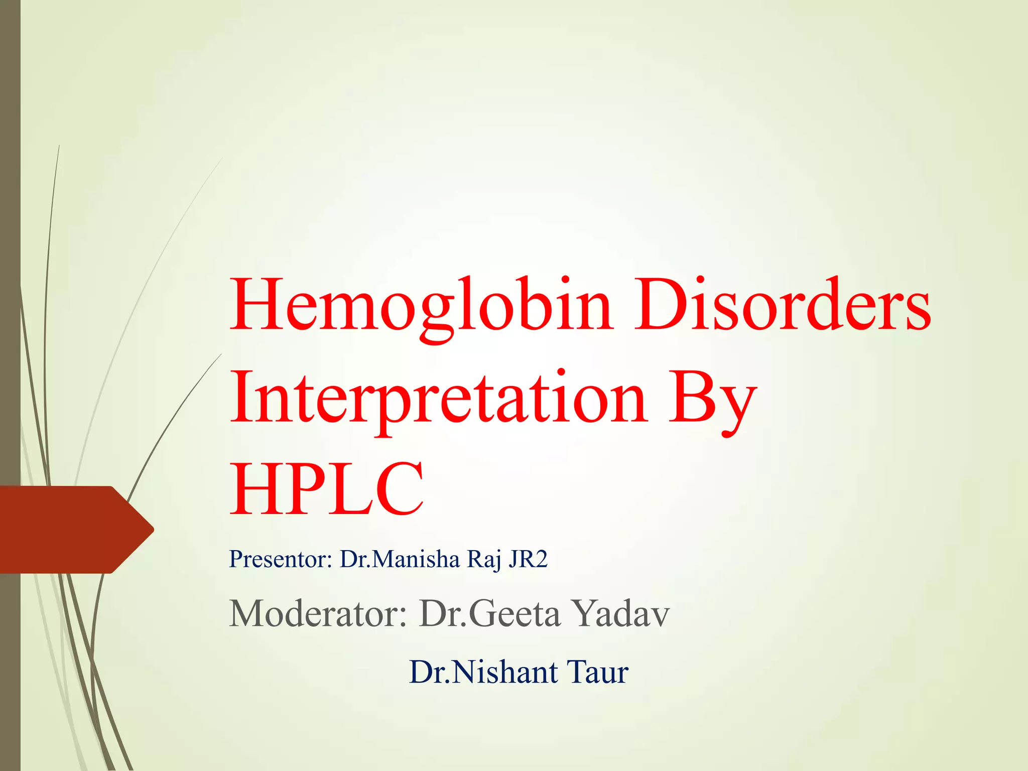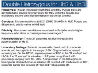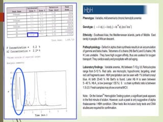 1. The document discusses the structure and function of normal hemoglobin and describes various hemoglobin abnormalities that can be detected using high-performance liquid chromatography (HPLC).