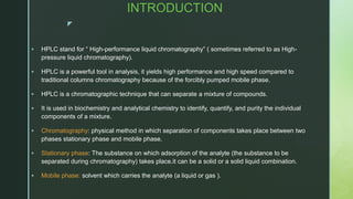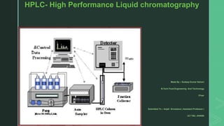 The document discusses High Performance Liquid Chromatography (HPLC), including its principles, types of separations, instrumentation, applications in fields like food and pharmaceuticals, and advantages like speed and accuracy over traditional chromatography techniques. HPLC uses high pressure to pass samples in liquid mobile phases through stationary phases in columns to separate mixtures based on properties like polarity, size, or ionic charge.