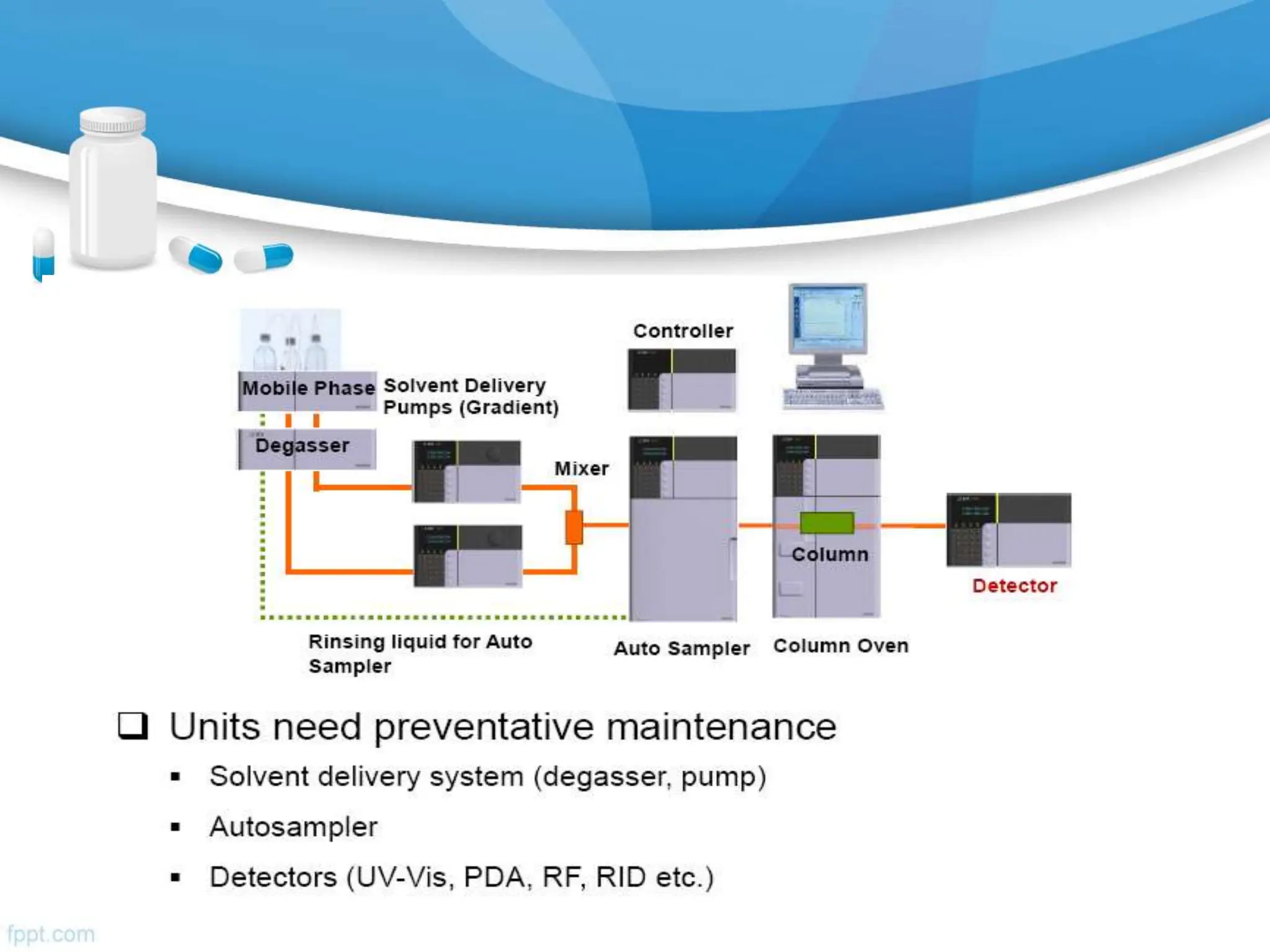 This document discusses the principles and operation of high performance liquid chromatography (HPLC). It covers basic HPLC instrumentation configuration and separation modes, including reversed phase and normal phase systems. Methods for converting between normal and reversed phase systems are provided. Various HPLC detectors are outlined, including UV-Vis, PDA, and ELSD detectors. The document also discusses HPLC maintenance strategies and preventative maintenance for individual modules. Good laboratory practices for HPLC are reviewed, such as solvent preparation, filtration, and buffer preparation. Finally, common problems and their solutions are addressed.