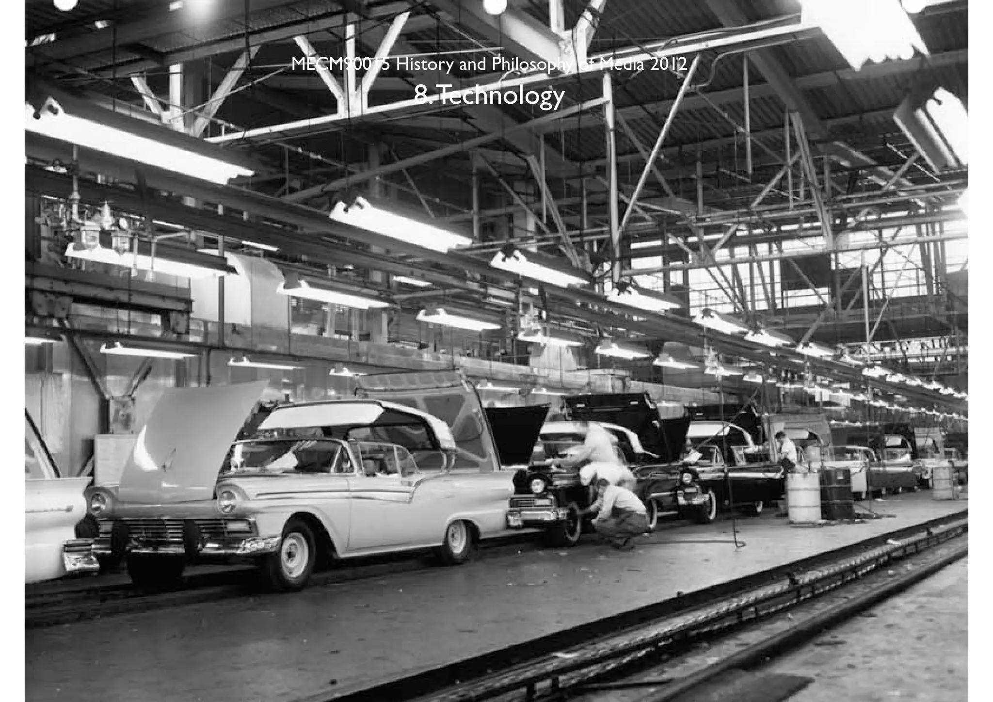 This document discusses the history and philosophy of media and technology. It touches on several key topics: