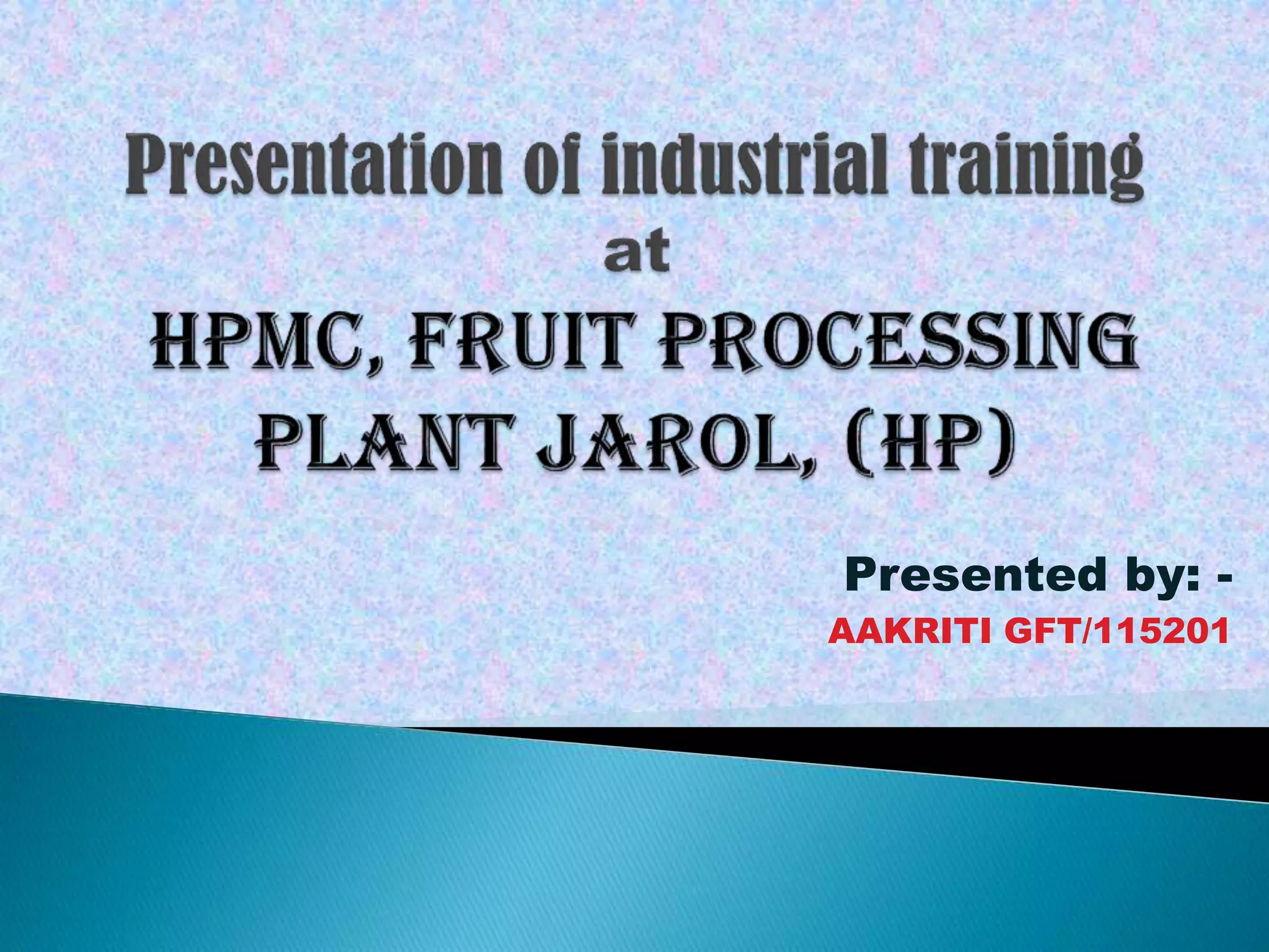 The document describes the processes for making several fruit-based food products including squashes, RTS beverages, pickles, jams, plum pulp, fruit juice concentrates, and fruit juice. For each product, the key steps in the production process are outlined, including preparation of the fruit, addition of other ingredients like sugar and acid, boiling, cooling, packaging, and storage. Quality control tests are also listed including tests for pectin, starch, acidity, total soluble solids, and SO2 levels. In the presentation, it is noted that the fruit processing plant produces various products on a daily basis and that all the fruit beverages produced are highly nutritious and thirst-quenching.