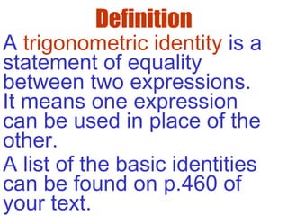 - Basic trigonometric identities relate trigonometric functions of the same angle. They allow one trig function to be substituted for another equivalent expression.