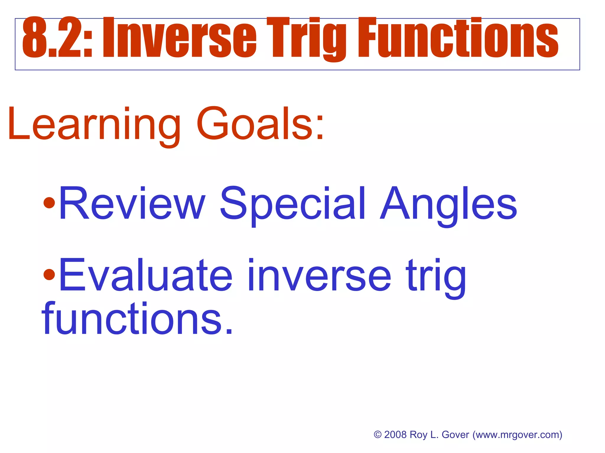 2) Examples are provided to demonstrate evaluating inverse trig functions and writing equations in inverse form. The principal values of inverse trig functions are defined as being between -90 and 90 degrees.