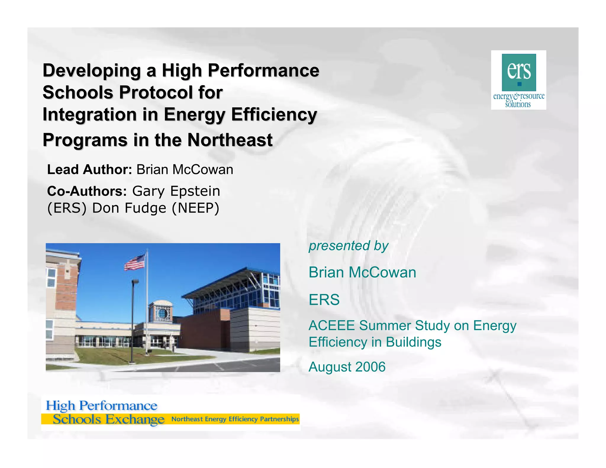 The document discusses the development of a regional high performance schools protocol for the Northeast. It establishes the Northeast High Performance Schools Exchange, managed by NEEP, which aims to implement high performance design, construction, and operation in new and renovated schools by 2010. The protocol is being developed to promote energy efficient and cost-effective school buildings that utilize sustainable technologies, while providing excellent learning environments. It receives funding from various sources and input from exchange members. The protocol seeks to balance state flexibility with consistency across the region and emphasis on educational and energy performance. It also explores options for regional versus state-by-state compliance documentation.