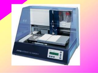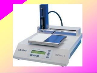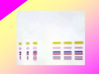 HPTLC is an improved form of TLC that utilizes a conventional TLC technique in a more optimized way. It allows for multiple sample application on pre-coated plates with thin adsorbent layers, providing simple, precise and reproducible chromatography. Key advantages of HPTLC over TLC include improved resolution, sensitivity and reproducibility due to thinner adsorbent layers and ability to apply many samples simultaneously. Detection methods for HPTLC include visualizing spots on the plate as well as instrumental analysis using a densitometer to directly measure components without elution. Proper sample preparation and selection of mobile phase and developing conditions are important for achieving good separation and resolution of components through HPTLC analysis.