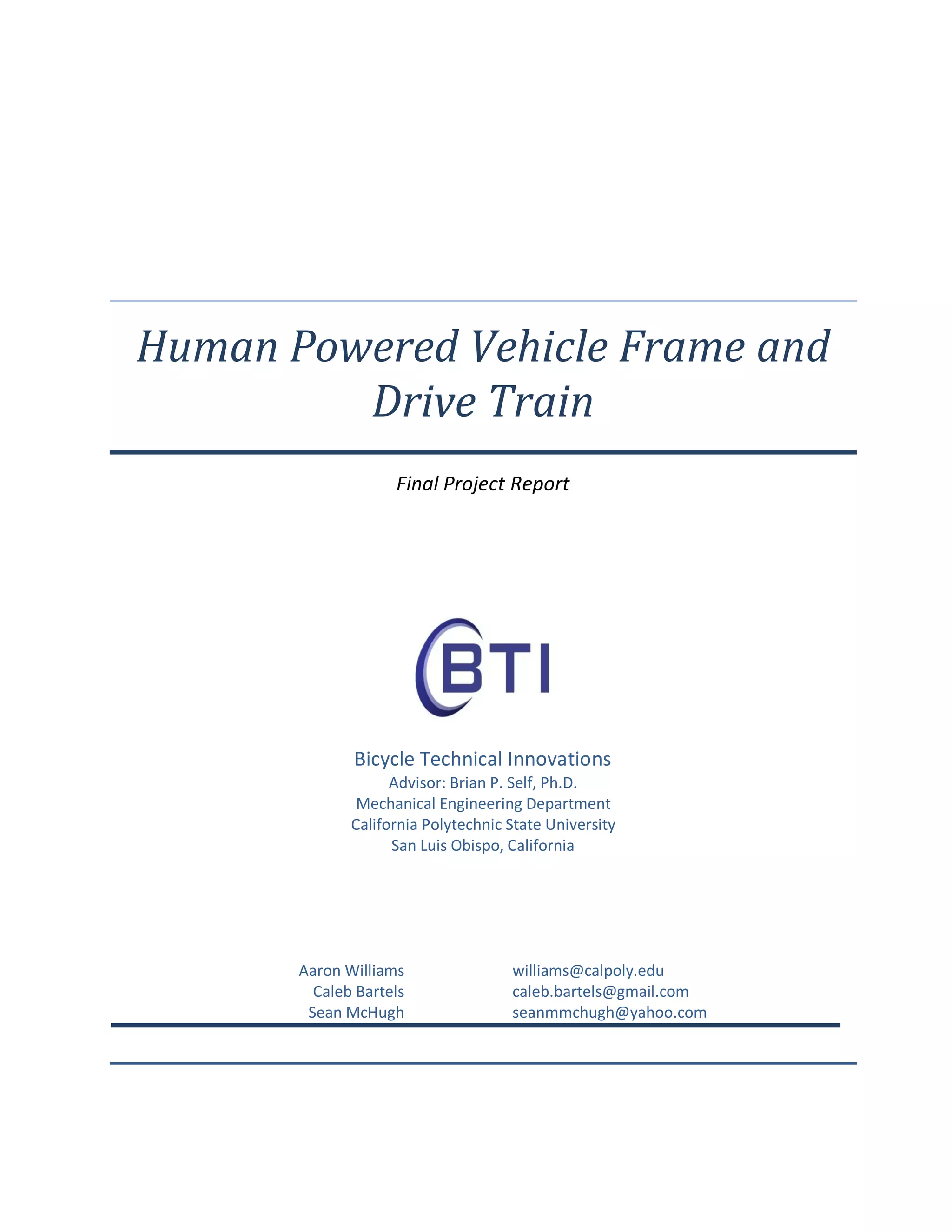 The report details the design and construction of a human-powered vehicle (HPV) for Cal Poly's entry in the ASME Human Powered Vehicle Challenge, focusing on a carbon fiber-epoxy frame and an innovative drive train. The team collaborated with HPV club leadership to establish engineering specifications, resulting in a prototype that achieves a 50% weight reduction compared to previous designs. Final designs and manufacturing plans, alongside analysis of the drive train and frame, have been documented, though further testing is required to validate performance.